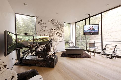 Nestled close to the most shining stars in Hollywood Hills’ best, the lavish home is packed with technology up to its teeth. Hollywood  is a CinemaScope theater with a JBL Synthesis system, a 7.1 Sonance architectural speaker layout in the family room and a separate video game room with a triple-screen auto racing simulator and a flat-panel TV.